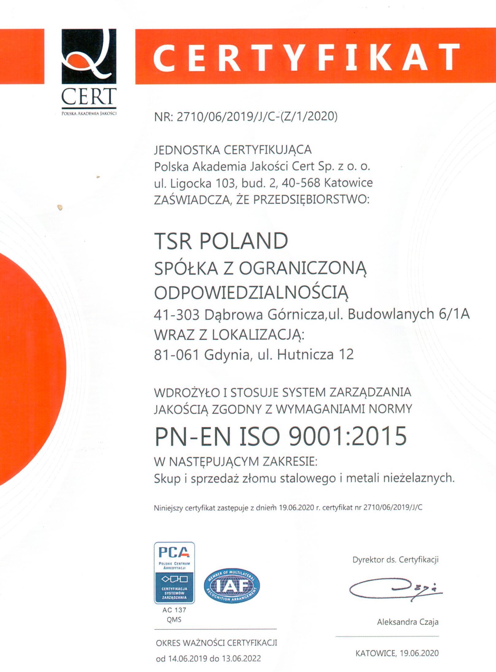 TSR Poland sp. z o.o. w roku 2019 uzyskał Certyfikat Systemu Zarządzania Jakością zgodny z wymaganiami normy PN-EN ISO 9001:2015.